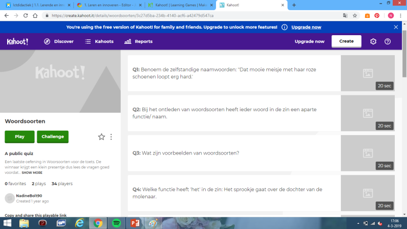 In mijn lessen maak ik regelmatig gebruik van Kahoot. Deze online quiz wordt door docenten zelf gemaakt. De vragen worden zelf bedacht, net als de antwoorden. Leerlingen kunnen aan de hand van een unieke code inloggen met hun pc of mobiele telefoon. Via een nickname kunnen ze meedoen met de quiz en zo hun antwoord op de vraag kenbaar maken. Deze multiple choice-quizzen zijn vaak erg populair onder leerlingen. Wat ik wel merk, is dat leerlingen regelmatig met andere zaken bezig zijn dan met quizzen. Als docent is er weinig zicht op datgene wat de leerling doet. Daarnaast merk ik, dat als ik dit middel te vaak inzet, leerlingen steeds minder enthousiast worden omdat ze het te vaak hebben gespeeld. Hiernaast heb ik een voorbeeld van een eigen quiz toegevoegd, evenals de bijbehorende link (https://create.kahoot.it/details/synoniemen/51b91686-221b-4bd8-b565-a0e919797dc6)