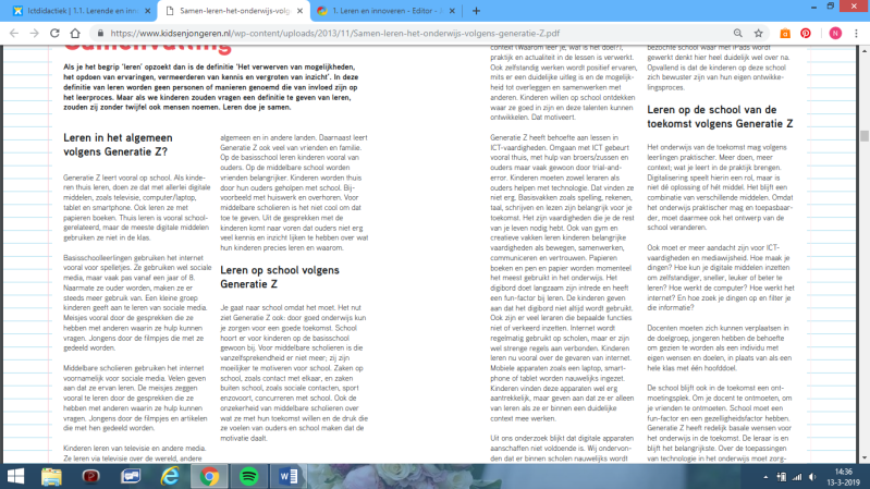 Uit onderzoek van Kennisnet (2013), terug te vinden via deze link (https://www.kidsenjongeren.nl/wp-content/uploads/2013/11/Samen-leren-het-onderwijs-volgens-generatie-Z.pdf), is gebleken dat leerlingen tegenwoordig steeds meer behoefte hebben aan lessen over ICT-gebruik. De huidige stroom leerlingen, ook wel Generatie Z genoemd, leert vooral op school. Hier leren ze niet alleen uit papieren boeken maar ook steeds meer aan de hand van digitale middelen. Hoewel uit het onderzoek ook blijkt dat leerlingen op het voortgezet onderwijs school ervaart als iets dat moet, zien ze het ook als een plek waar geleerd wordt en waar talenten ontdekt kunnen worden. De jongeren die in het onderzoek centraal staan, geven aan dat digitale middelen niet altijd correct worden ingezet maar dat ze dit niet erg vinden. Wel vinden ze het belangrijk dat de context en de doelen van het gebruik duidelijk zijn. Leerlingen geven aan dat dit niet voldoende gebeurt. Ik vind het, als docent, erg belangrijk dat leerlingen voldoende vaardigheden opdoen via digitale leermiddelen en dat de relatie tussen deze middelen en het leren centraal staat. ICT-middelen hebben tegenwoordig een meer centrale plek in de les maar het moet wel zodanig ingezet worden dat leerlingen er iets van leren en dat het ook toepasbaar is bij andere vakken of in meerdere situaties. Dit zal er ook toe leiden dat leerlingen meer gemotiveerd zijn om goed mee te doen in de les.