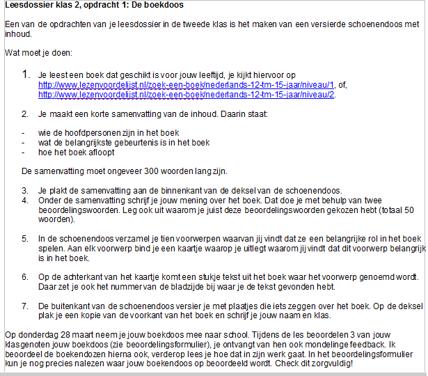 Bij ons op school is er maar een kleine sectie Nederlands. Daarom worden interessante, leuke opdrachten vaak met elkaar gedeeld. Vooral opdrachten of werkvormen op het gebied van ICT worden gedeeld omdat de sectie daar soms nog best moeite mee heeft. Ik werk veel samen met een collega die parallelklassen met mij heeft. Beide geven we les aan de brugklas en klas 2. In klas 2 zijn we nu allebei bezig met leesbevordering. Omdat boekverslagen en boekpresentaties erg standaard zijn, hebben we afgesproken om de leerlingen wat meer uit te dagen. Daarom zijn we beide op zoek gegaan naar een interessante verwerkingsopdracht. Via via kwam mijn collega terecht bij een filmpje over een boekendoos: https://www.youtube.com/watch?v=iwmLeCdfAdc.