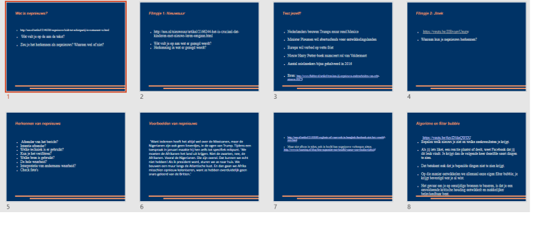 In mijn lessen merk ik dat leerlingen nog niet altijd weten hoe ze iets op moeten zoeken op internet. Vaak typen ze iets in dat niet zo veel met de zoekterm te maken heeft. Ook merk ik dat leerlingen niet goed weten wat een bron is. Aangezien dit erg belangrijk is om bepalen of de informatie betrouwbaar is of niet, heb ik hier bij verschillende stages aandacht aan besteed. In een vwo-plus 2 klas heb ik een les gemaakt over nepnieuws. Hier heb ik twee interessante filmpjes bijgevoegd. Vervolgens moesten zij in de les erna zelf op zoek gegaan naar nieuws en bepalen wanneer iets betrouwbaar is of niet.
